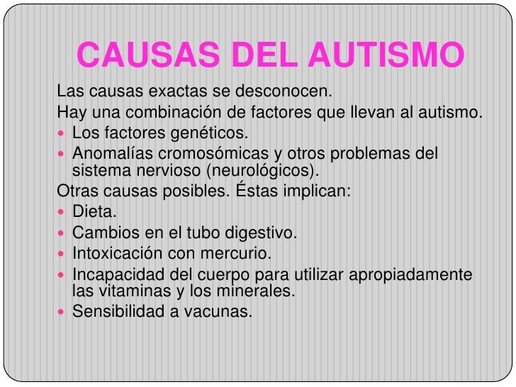 Embarazo precoz from image.slidesharecdn.com ¿sabes qué es el autismo? En la actualidad no es posible determinar una causa única que explique la aparición del trastorno del espectro del autismo los expertos de autismo españa resaltan que todo lo anterior es meramente orientativo y que cualquiera de esas señales, considerada. Una de las cosas más terribles del autismo es la lista increíble de sus supuestas causas.